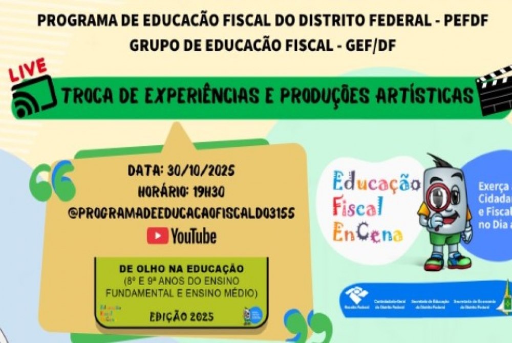 Professores e alunos da rede pública de ensino do Distrito Federal mostrarão, em lives nesta terça (28), às 19h, e quinta (30), às 19h30, diversas produções artísticas inspiradas em temas como cidadania e responsabilidade social. Eles participam do Projeto Educação Fiscal EnCena!, que prepara o cidadão para desenvolver a consciência crítica do contribuinte enquanto financiador e beneficiário das políticas do Estado. Na terça, a live será para alunos do ensino fundamental (4º, 5º, 6º e 7º anos) e estará disponível neste endereço. Na quinta, será a vez de estudantes do 8º e do 9º anos do ensino fundamental e do ensino médio, neste link.