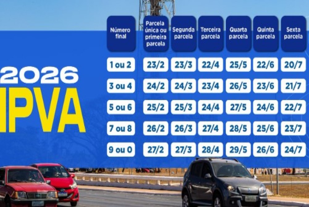 A Secretaria de Economia do Distrito Federal (Seec-DF) lembra aos proprietários de veículos que o prazo para pagamento das parcelas do IPVA para o exercício de 2026 começa na segunda-feira (23). O contribuinte tem até a sexta-feira (27) para quitar a primeira (ou única) parcela, dependendo do dígito final da placa do veículo. As que têm final com 1 ou 2 pagam no dia 23 e assim sucessivamente.